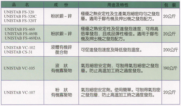联合化学提供适用于PVC工业需求的广泛产品組合。多样化的产品組合包括全系列的稳定剂 、有机锡稳定剂、增塑剂、滑剂、发泡促进剂、加工助剂及可解決许多加工问题的多样化添加剂。改善产品品质、加工工艺、提升客戶产品优良率及效率是公司对客戶的承诺。客戶在生产配方及加工工艺上更由联合化学良好训练及具有丰富经验的服务团队来支持。